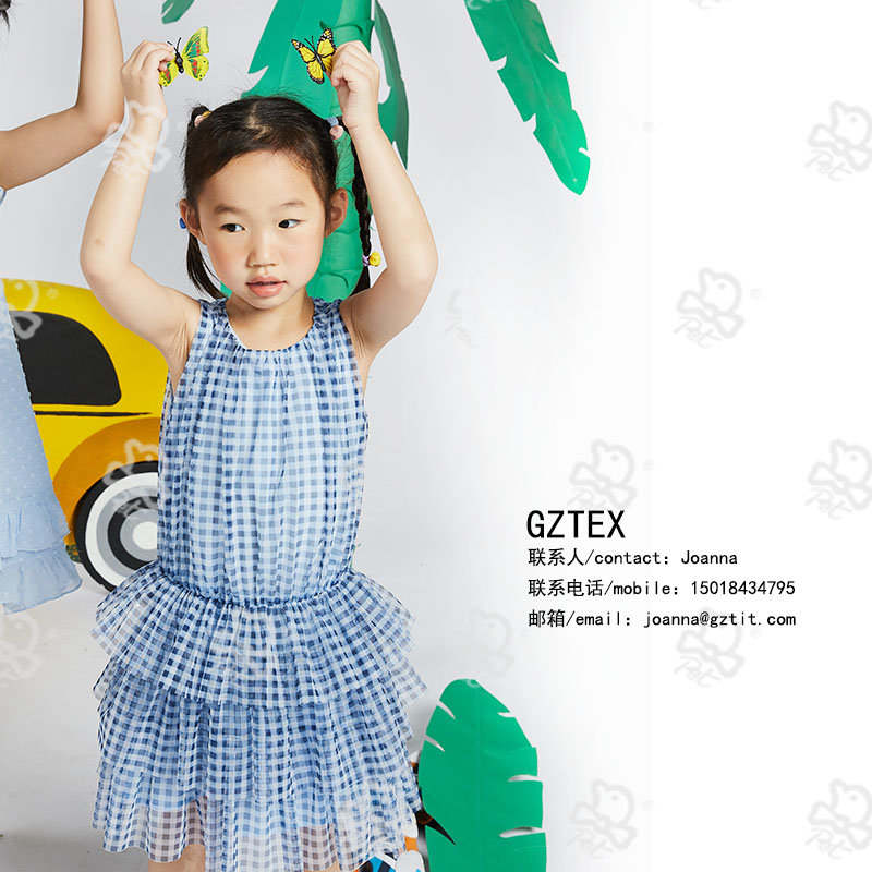 蓝色印花网布连衣裙,领了收褶,下摆网布散口,后背开隐形拉链。